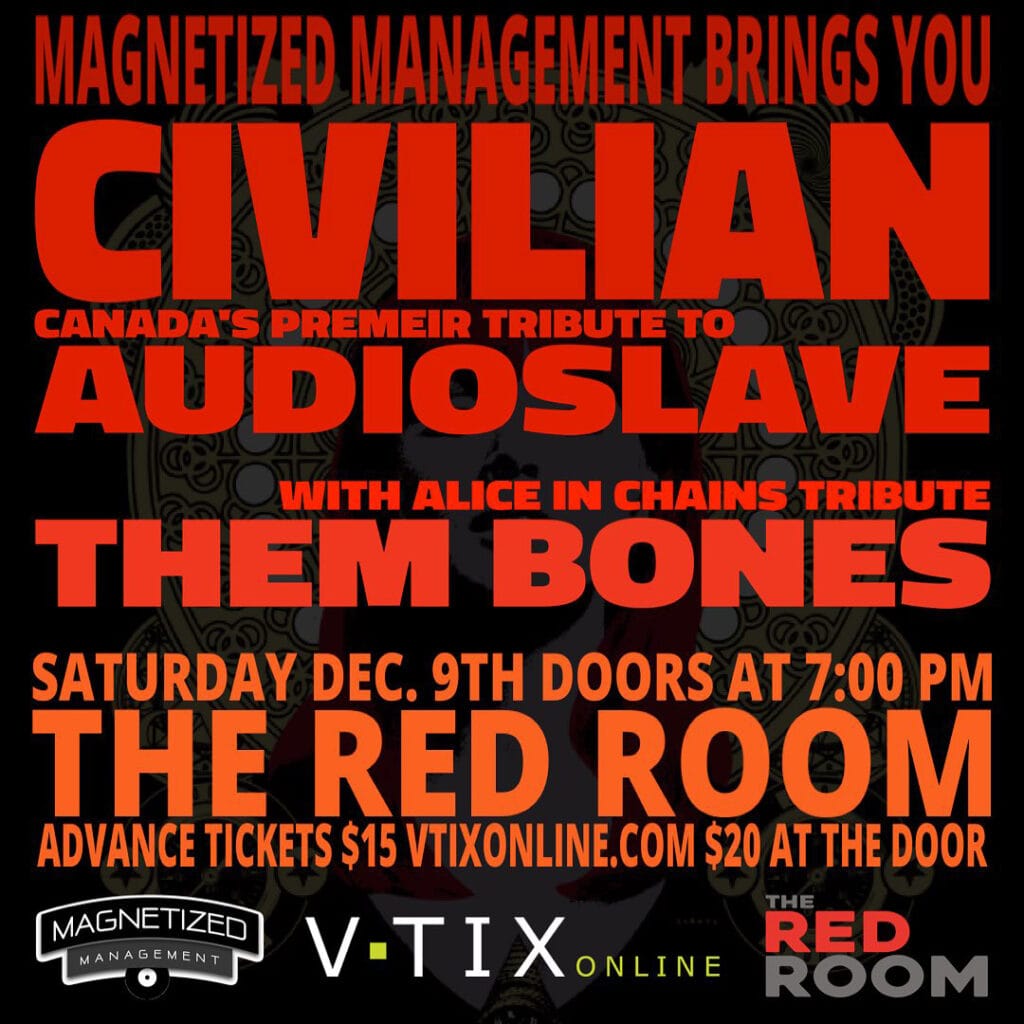 For the first time ever, Magnetized Management presents Civilian: A tribute to Audioslave at The Red Room, with our very special guests, Alice In Chains tribute, Them Bones, on Saturday December 9th. Doors will open at 7:00 pm and show will get underway shortly after with Them Bones kicking off the night. Advance tickets are […]