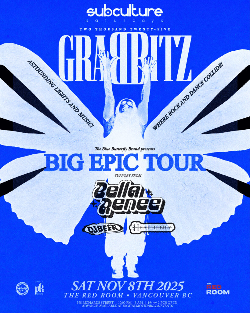 Digital Motion presents SUBculture Saturdays 11.08.2025 BIG EPIC TOUR Join us for a very special presentation featuring hit producer, singer, songwriter with collaborations with some of the biggest names in EDM today. Grabbitz has collaborated with top-tier artists such as Rezz, Illenium, Zedd, Subtronics, Sullivan King and more. His recent endeavours include launching Blue Butterfly Records, […]
