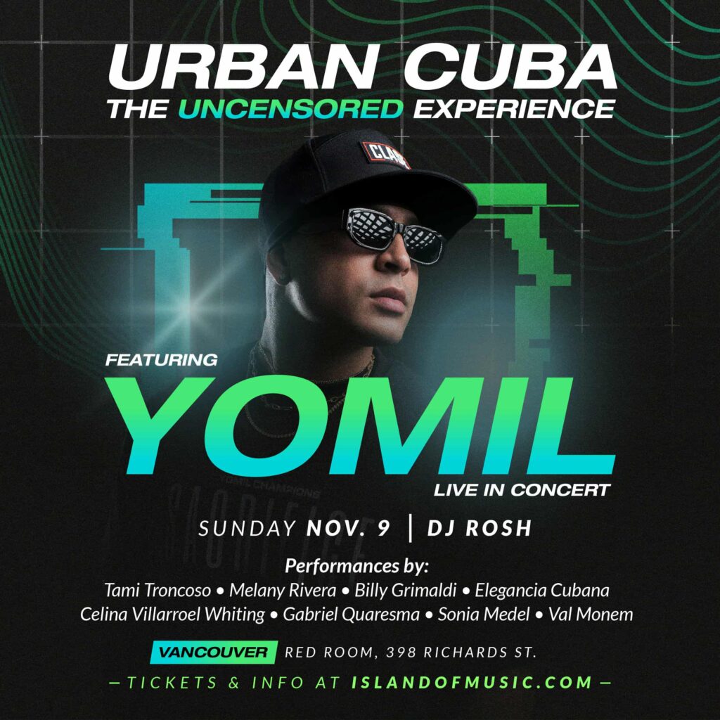 Island of Music presents URBAN CUBA feat. YOMIL Live in Concert TICKETS: https://www.vtixonline.com/yomil/5191/ Sunday November 9th Venue: The Red Room, 398 Richards St – Vancouver Doors at 7PM – Show starts at 8:30 – Early arrival is highly recommended! 19+ only with 2 pieces of Valid ID to enter the venue – NO MINORS! Tickets: $65 […]